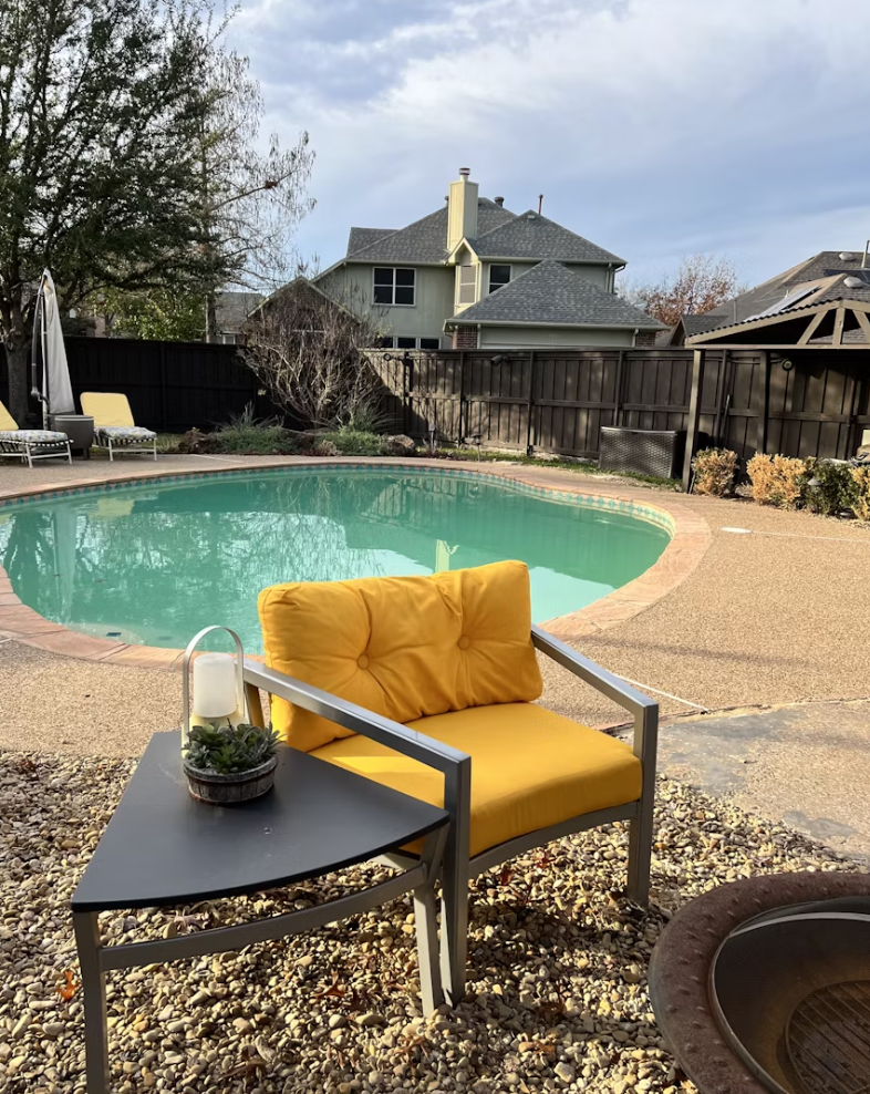 La photo ci-dessus capture cette ambiance unique : un fauteuil jaune éclatant face à la piscine turquoise, un ciel lumineux et la quiétude d’un jardin corse.