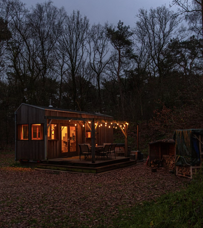 À la nuit tombée, la façade se dore, les guirlandes dessinent une constellation intime. On dresse la table sous l’auvent, on s’installe dans les fauteuils, plaid sur les genoux, bois qui craque dans le poêle extérieur (selon saison). La forêt murmure, la ville disparaît. Cette atmosphère “cabane-design” est la signature de La Manufacture des Amants : une love room Lille qui donne envie de rester dehors… juste assez pour mieux revenir dedans.